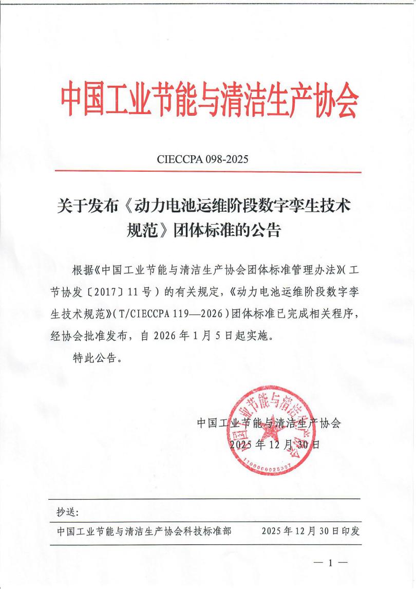 关于发布《动力电池运维阶段数字孪生技术规范》团体标准的公告