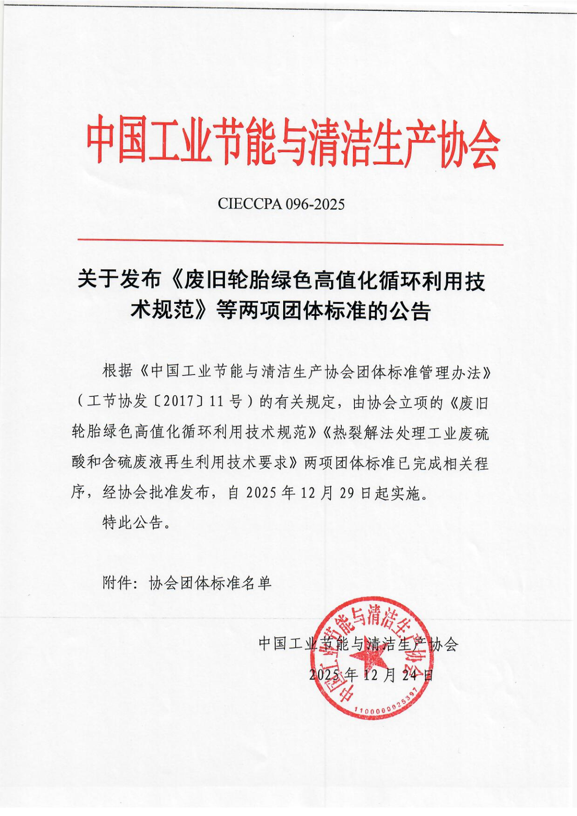 关于发布《废旧轮胎绿色高值化循环利用技术规范》等两项团体标准的公告