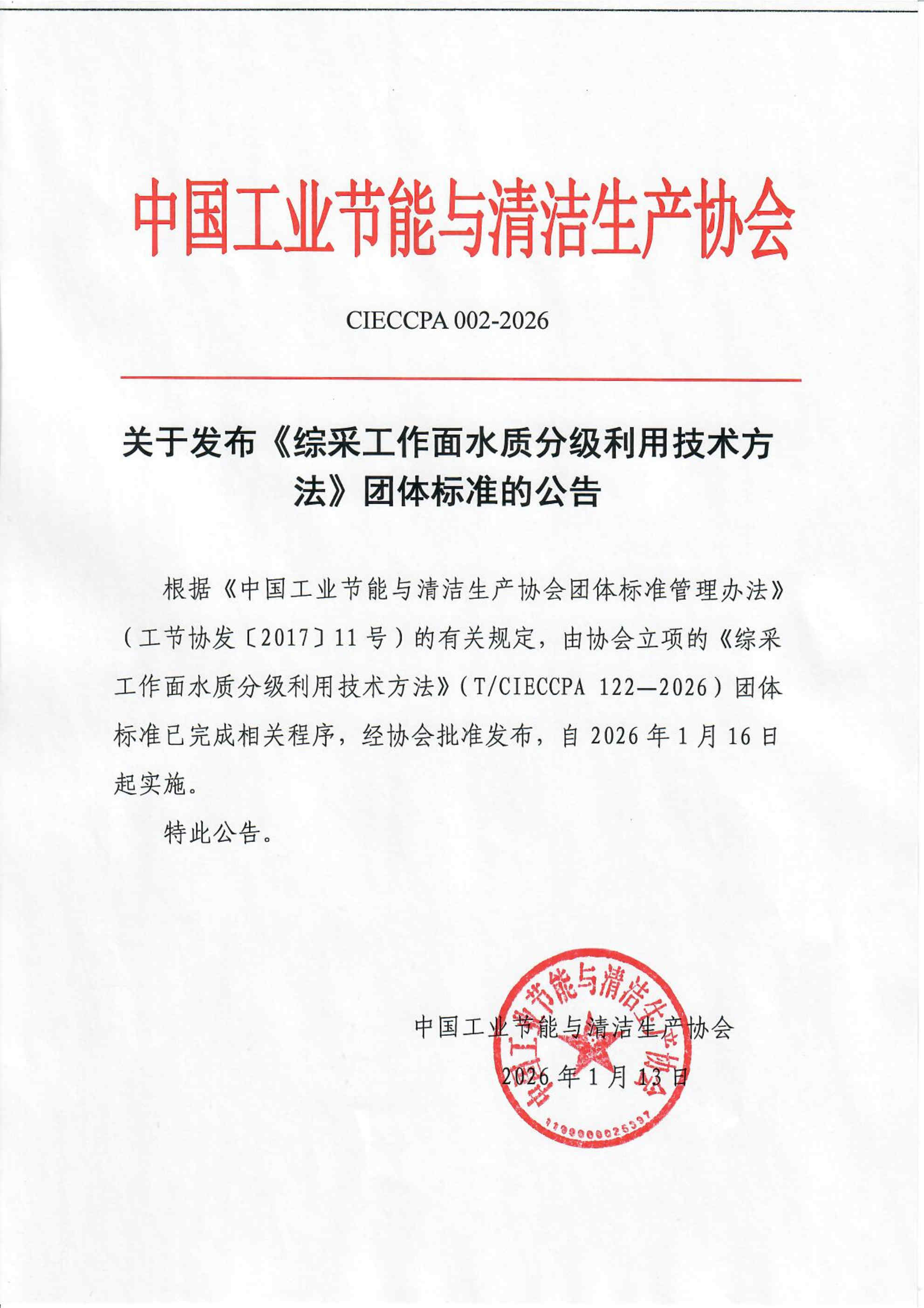 关于发布《综采工作面水质分级技术方法》团体标准的公告