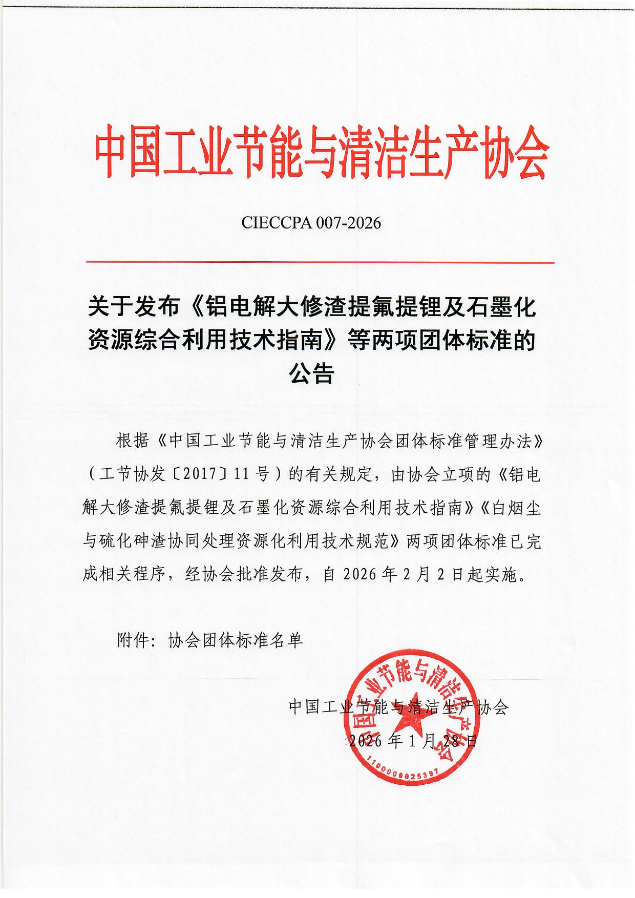 关于发布《铝电解大修渣提氟提锂及石墨化资源综合利用技术指南》等两项团体标准的公告