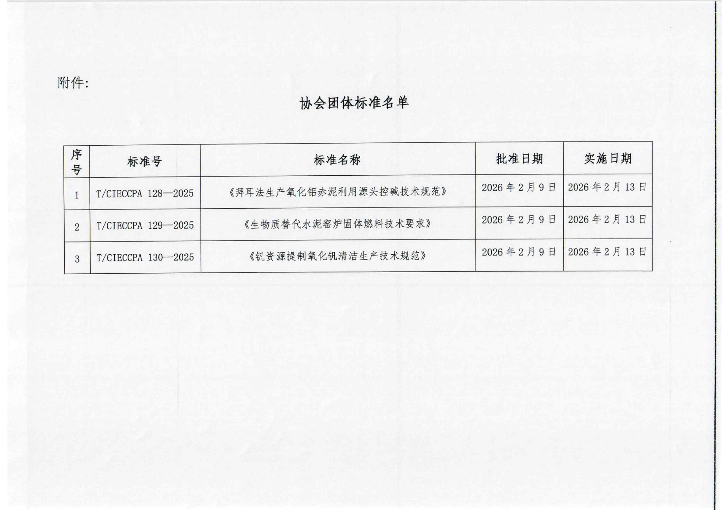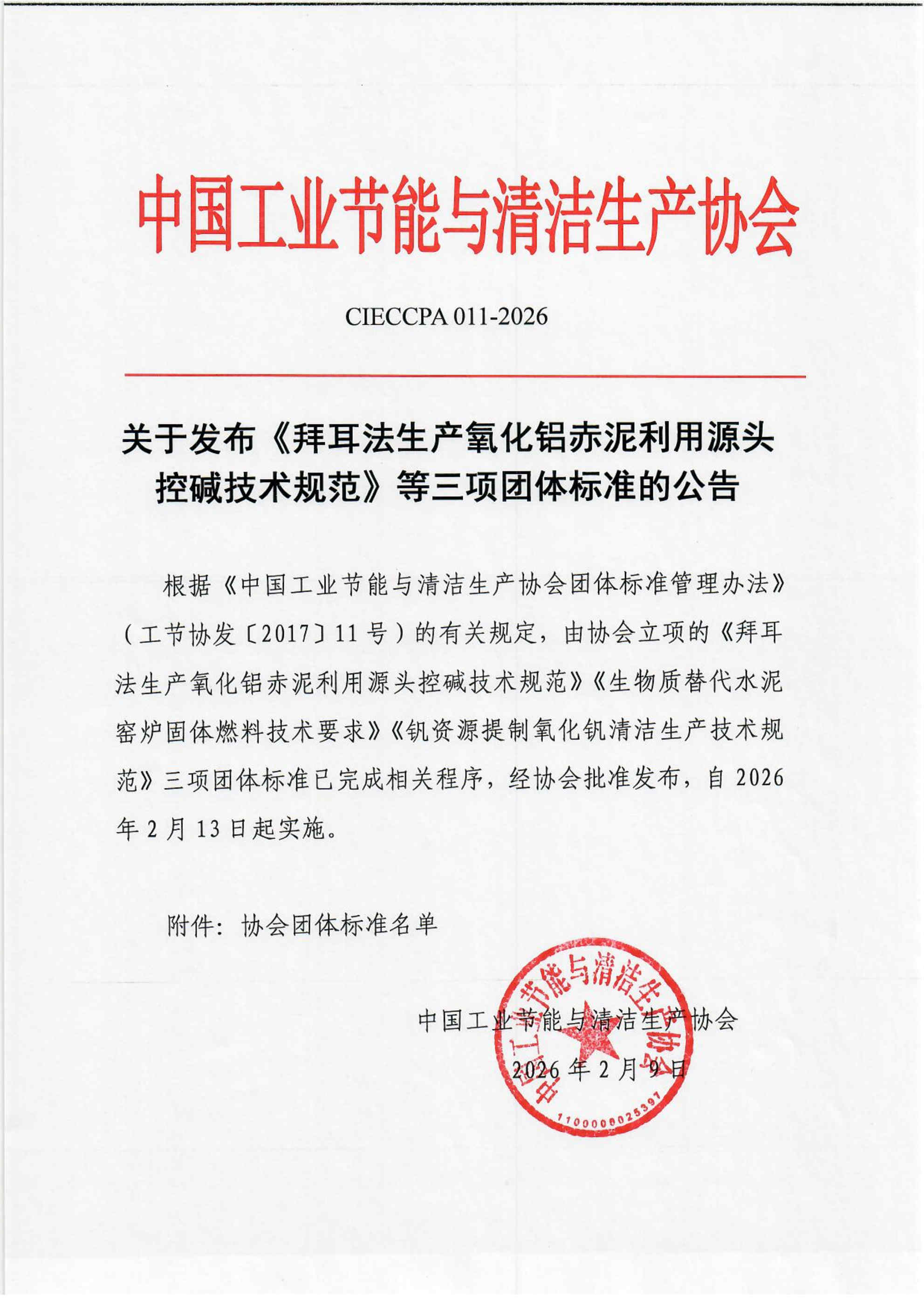 关于发布《拜耳法生产氧化铝赤泥利用源头控碱技术规范》等三项团体标准的公告