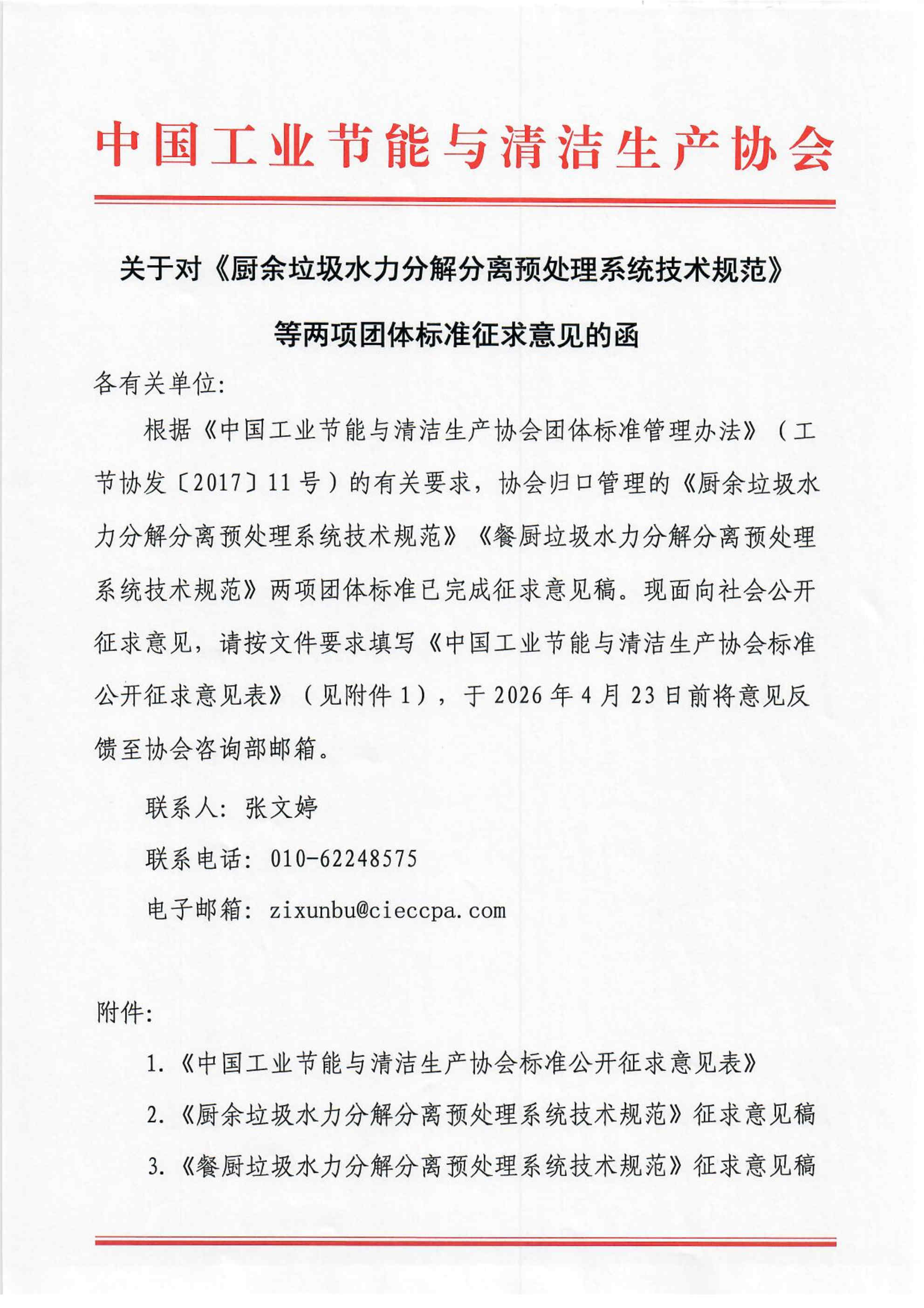 关于对《厨余垃圾水力分解分离预处理系统技术规范》等两项团体标准征求意见的函