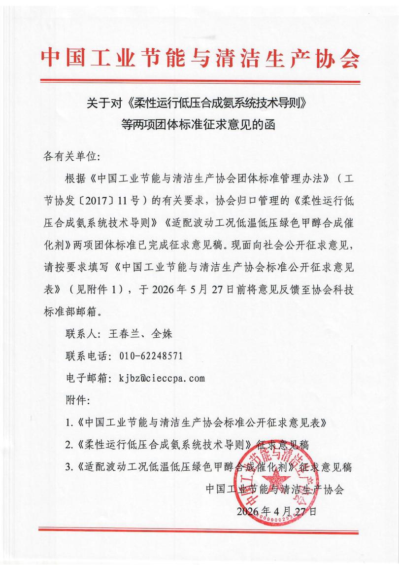 关于对《柔性运行低压合成氨系统技术导则》等两项团体标准征求意见的函