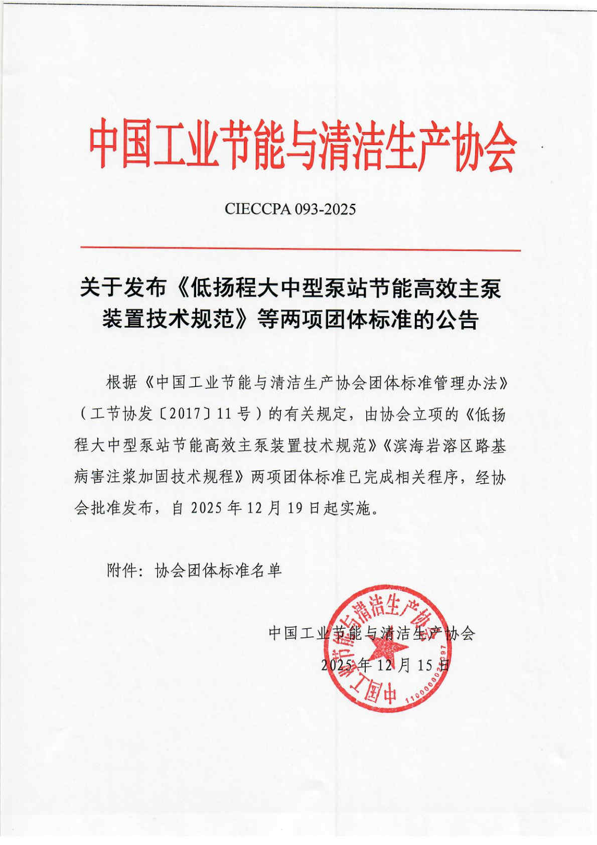 关于发布《低扬程大中型泵站节能高效主泵装置技术规范》等两项团体标准的公告
