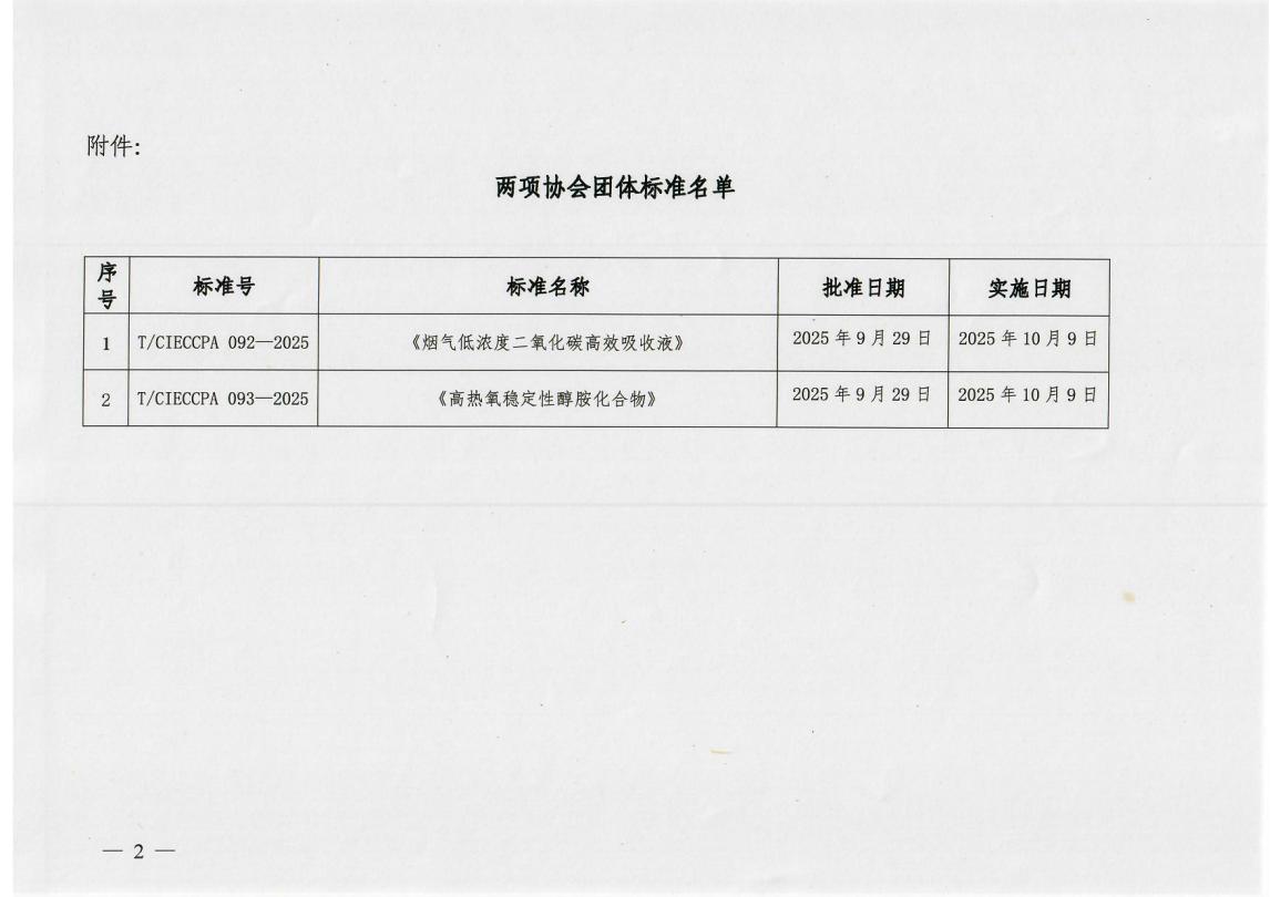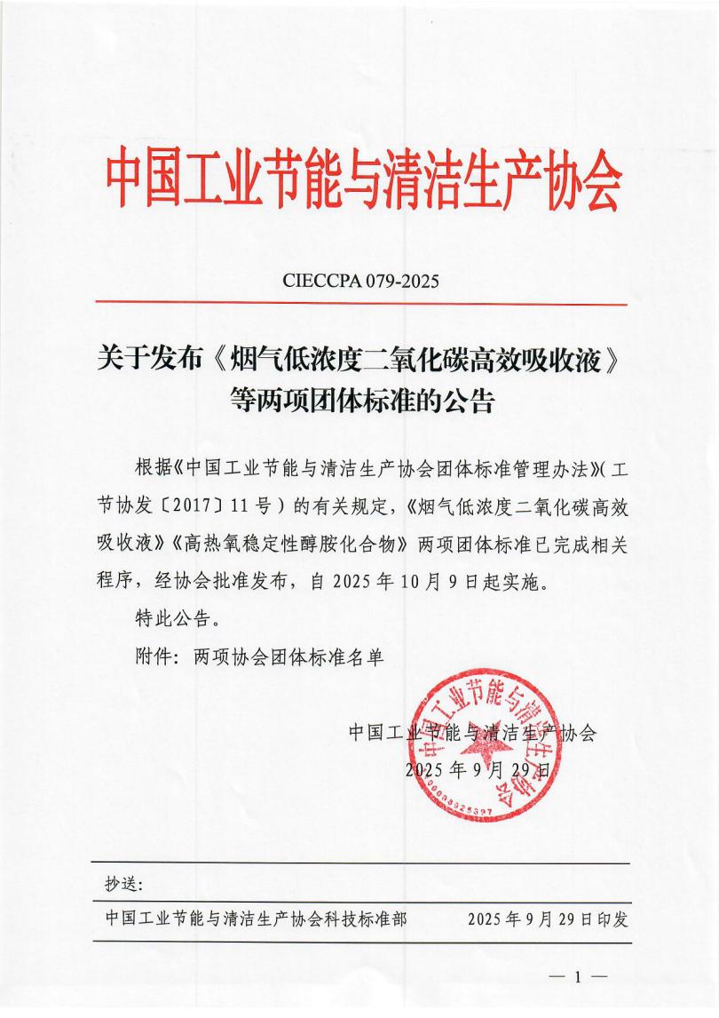 关于发布《烟气低浓度二氧化碳高效吸收液》等两项团体标准的公告