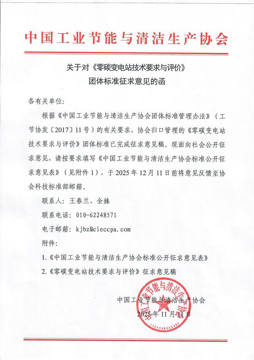 关于对《零碳变电站技术要求与评价》团体标准征求意见的函