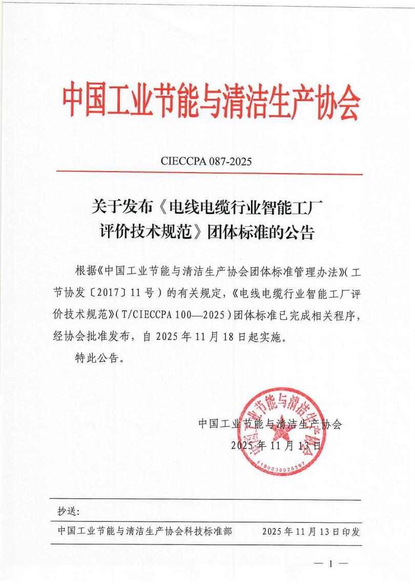 关于发布《电线电缆行业智能工厂评价技术规范》团体标准的公告