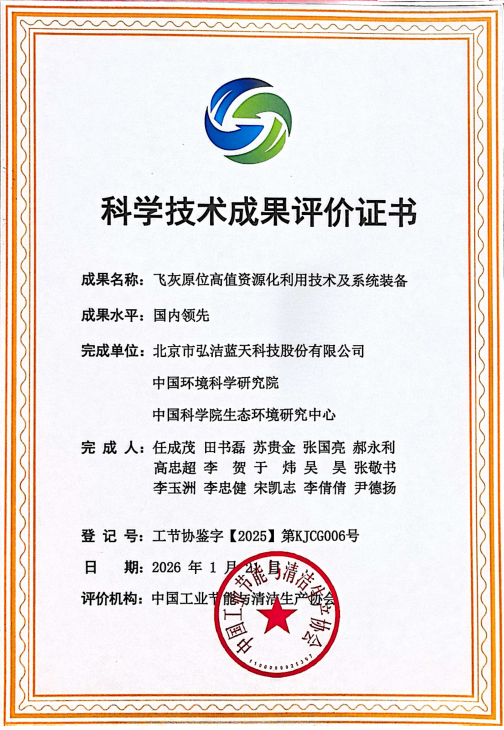 中国工业节能与清洁生产协会于2026年1月21日在北京组织召开了“飞灰原位高值资源化利用技术及系统装备”科技成果评价会,该成果由北京市弘洁蓝天科技股份有限公司、中国环境科学研究院及中国科学院生态环境研究中心联合完成。会议特邀七位行业知名专家,围绕该技术及系统装备的完成质量、创新价值、技术先进性,以及其产生的环境、社会与经济效益展开全面评估。