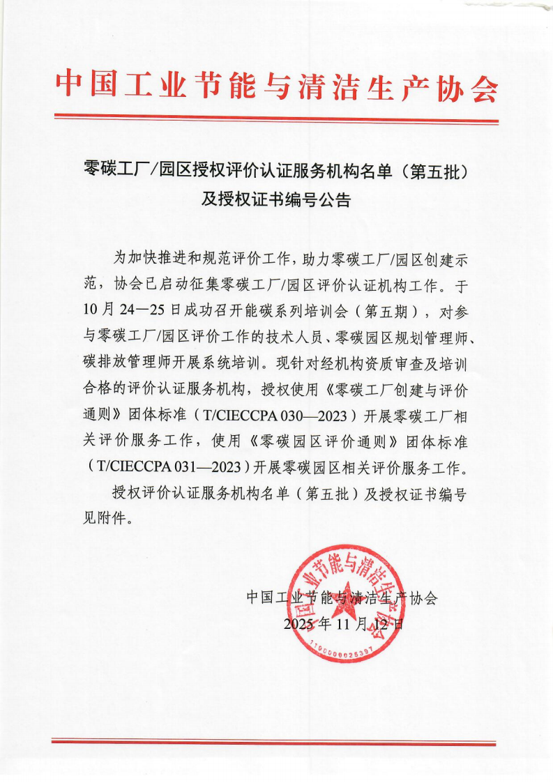 零碳工厂园区授权评价认证服务机构名单(第五批)及授权证书编号公告