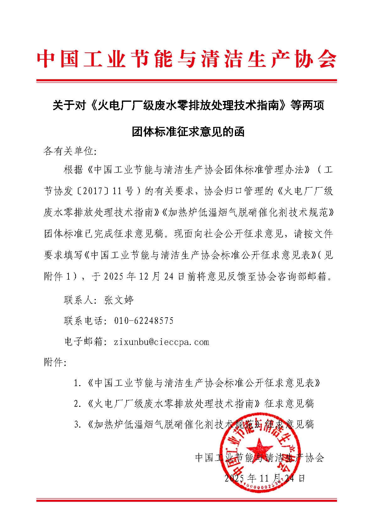 关于对《火电厂厂级废水零排放处理技术指南》等两项团体标准征求意见的函