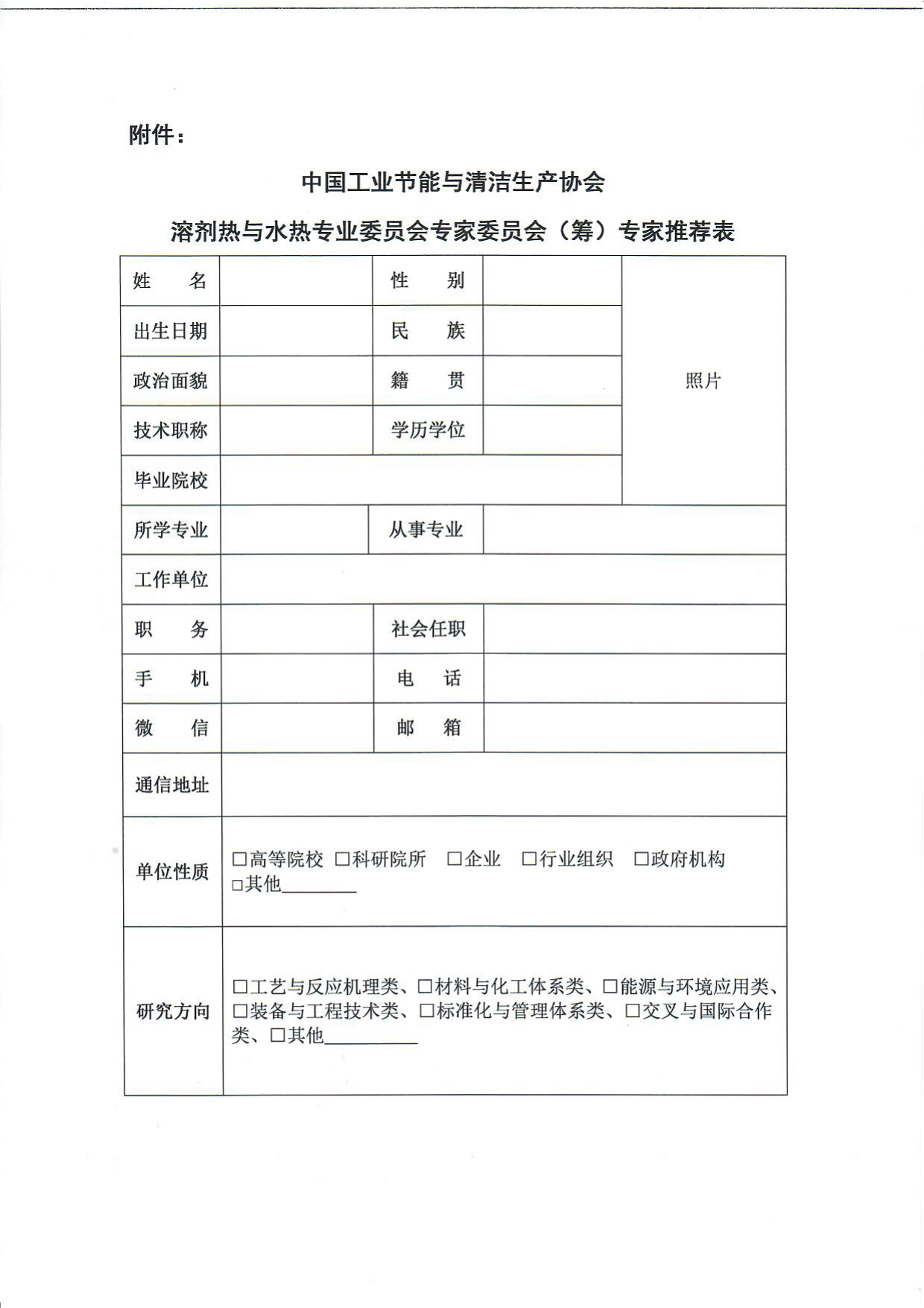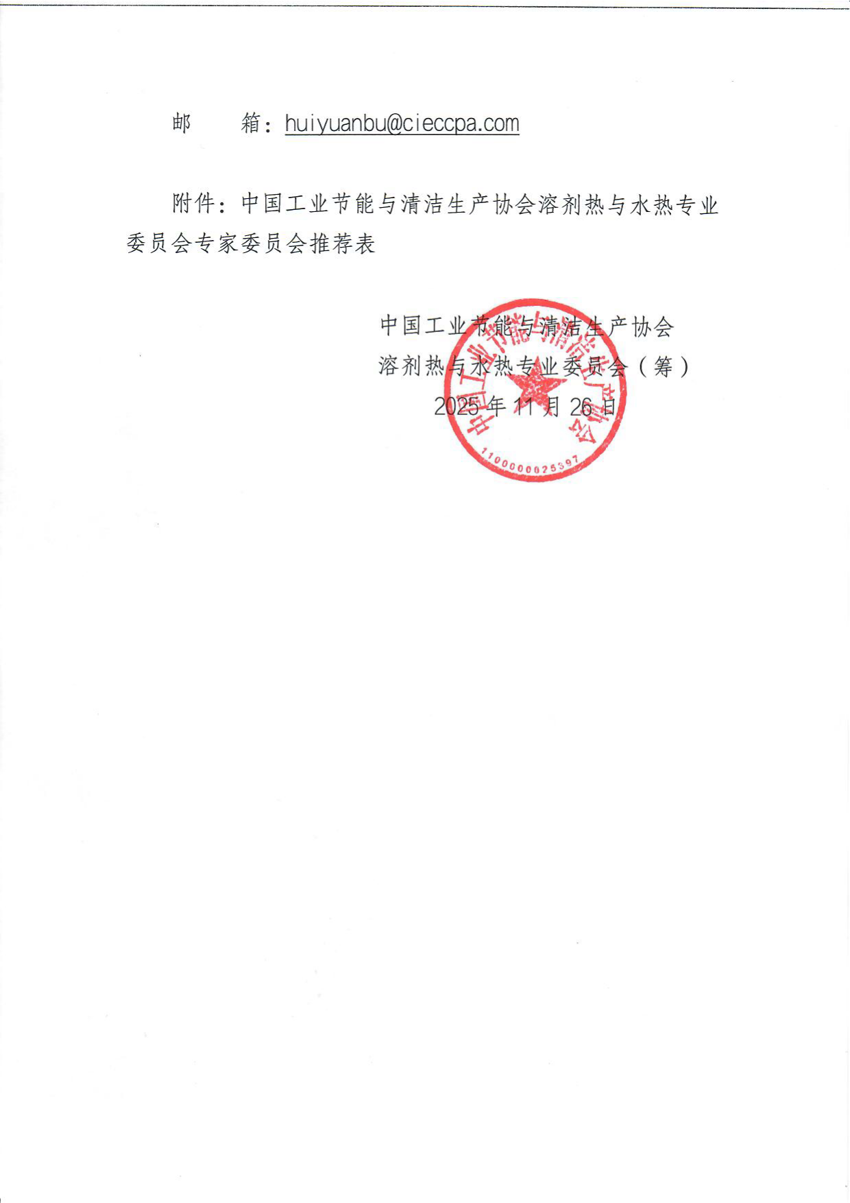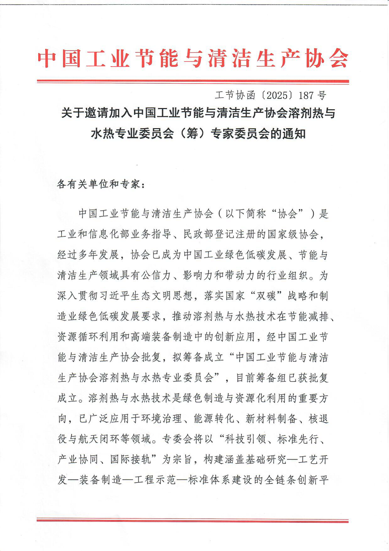 关于邀请加入中国工业节能与清洁生产协会溶剂热与水热专业委员会(筹)专家委员会的通知