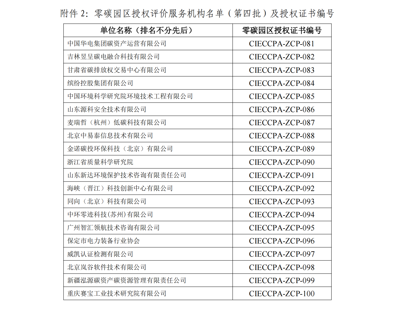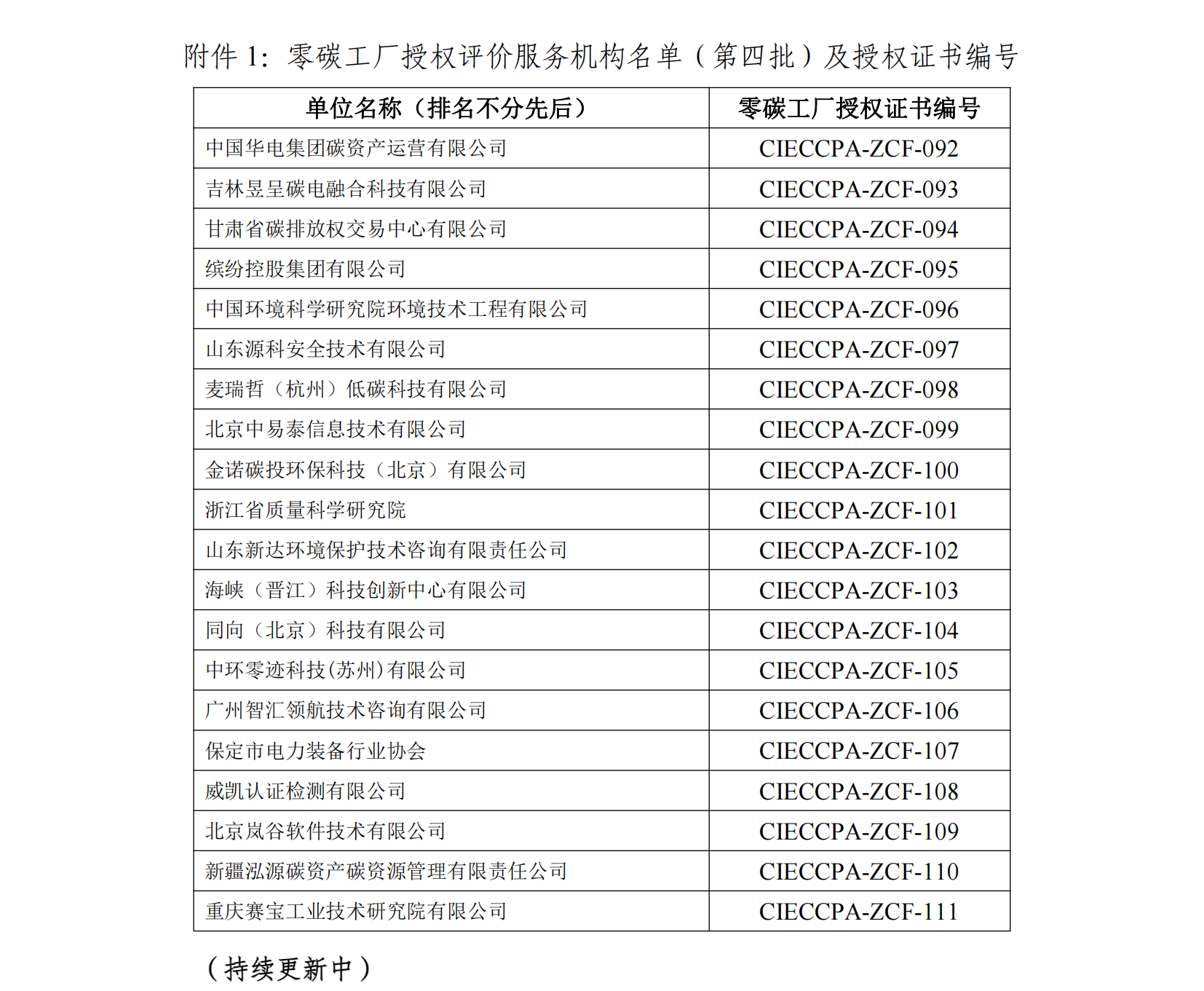 零碳工厂园区授权评价认证服务机构名单(第四批)及授权证书编号公告