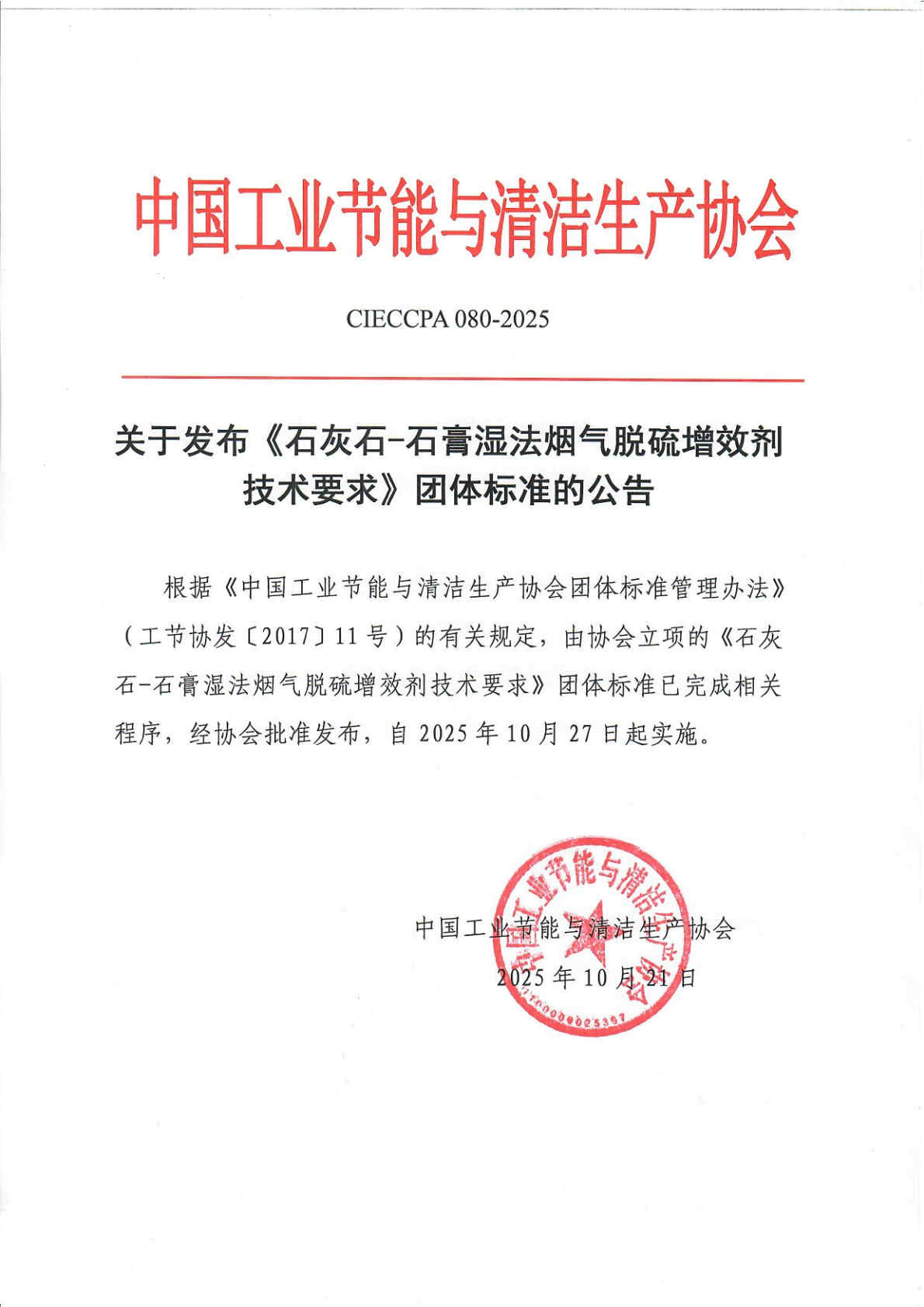 关于发布《石灰石-石膏湿法烟气脱硫增效剂技术要求》团体标准的公告