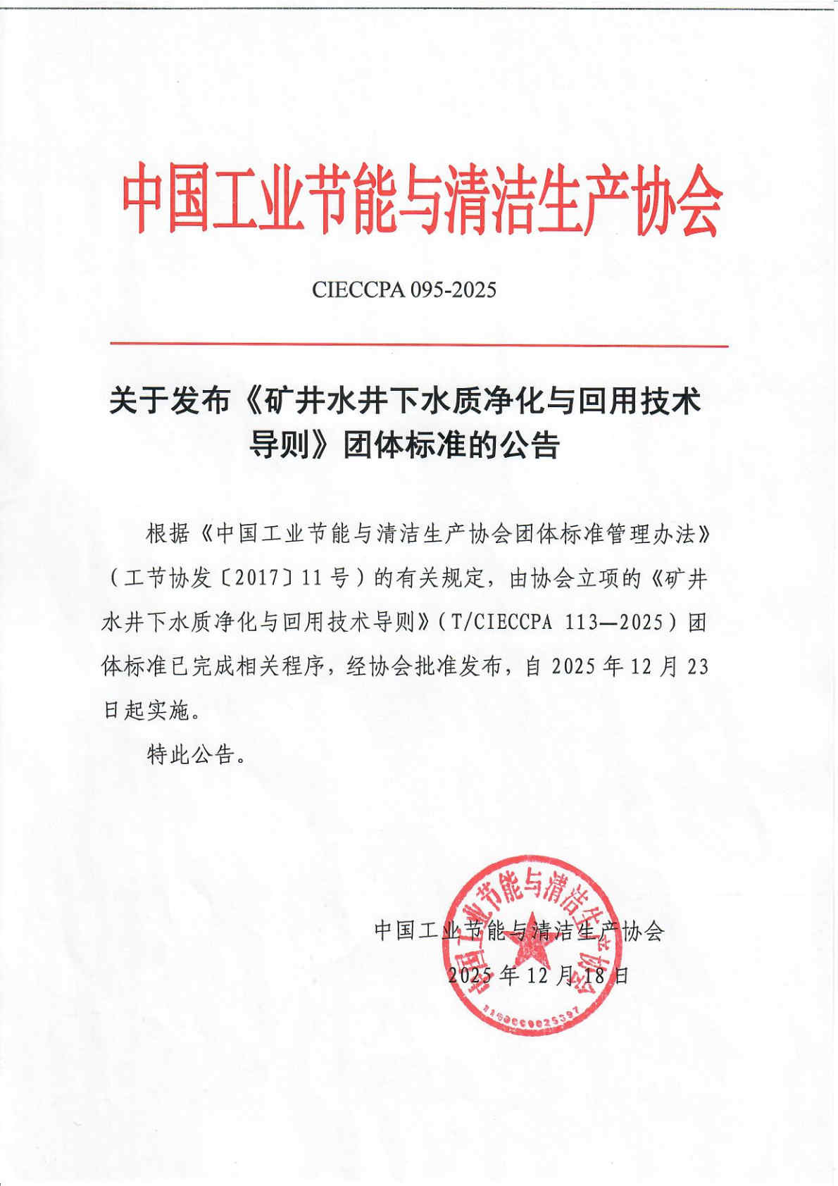 关于发布《矿井水井下水质净化与回用技术导则》团体标准的公告